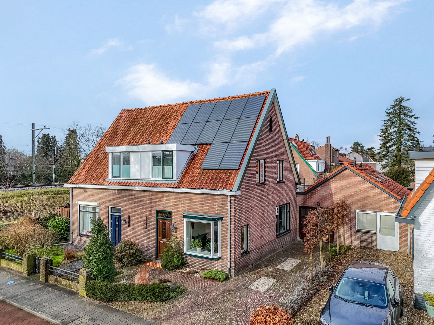 De oprit, met toegang tot de berging en praktijk, is aangelegd met sierbestrating die goed past bij het karakter van de woning. Deze ‘klassieke’ stijl zie je ook in de voortuin, met beplanting die ook in de winter groen is.