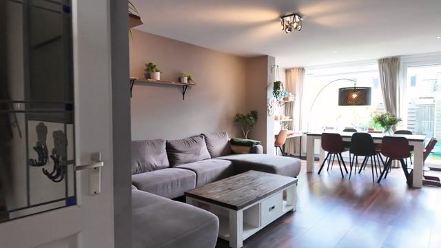 Bij binnenkomst kom je in de hal met de meterkast en het separate toilet. Vanuit hier loop je door naar de ruime en lichte woonkamer van circa 35 m². De woonkamer voelt ruim en open aan dankzij de grote raampartijen. Via de openslaande deuren heb je direct toegang tot de achtertuin, waardoor binnen en buiten mooi in elkaar overlopen. Aan de voorzijde van de woning bevindt zich de halfopen keuken van circa 9 m². Deze keuken is in 2016 vernieuwd en voorzien van diverse inbouwapparatuur, waaronder een kookplaat, afzuigkap, magnetron, oven, koel-vriescombinatie en vaatwasser. Daarnaast is er een Howat heetwaterkraan aanwezig, ideaal voor direct kokend water. Dankzij het grote raam valt er ook hier veel daglicht naar binnen.