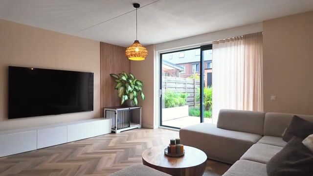 Via de entree met meterkast, toilet en trapopgang kom je in de woonkamer. Dankzij de grote schuifpui kijk je direct fijn de tuin in. De open indeling zorgt voor een prettige verbinding tussen wonen, koken en eten. De lichte open keuken biedt veel opbergruimte en is uitgerust met een inductiekookplaat, afzuigkap, oven, combi-oven, koelkast en vaatwasser. De trapkast is ideaal voor extra voorraad of huishoudelijke apparatuur. De gehele begane grond is voorzien van comfortabele vloerverwarming.