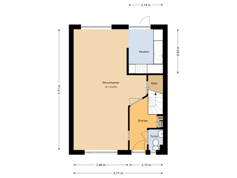 Via de entreehal, met toegang tot het toilet, meterkast en trapopgang, bereikt u het leefgedeelte.
