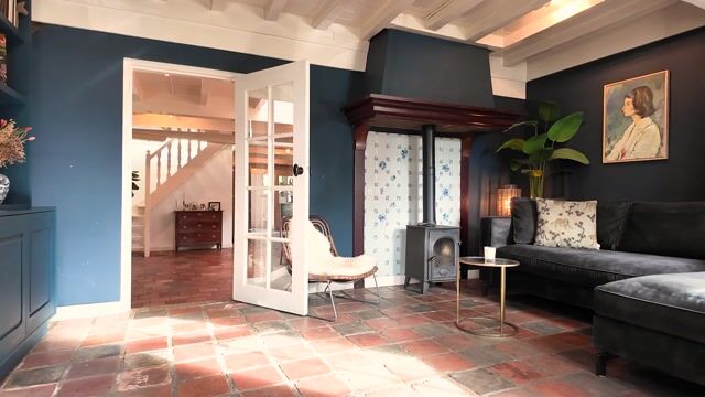 Upon entering, the warm atmosphere and authentic character immediately stand out. The living room at the front is cozy and bright, featuring an original fireplace with a wood stove and ample space for a comfortable sitting area. The room continues into the dining area with a high ceiling and an impressive vide, creating a wonderful sense of space and an abundance of natural light. Here, authenticity and design come together beautifully: wooden beams, a warm terracotta floor (with underfloor heating), and a stylish wood stove make this an inviting place to gather.