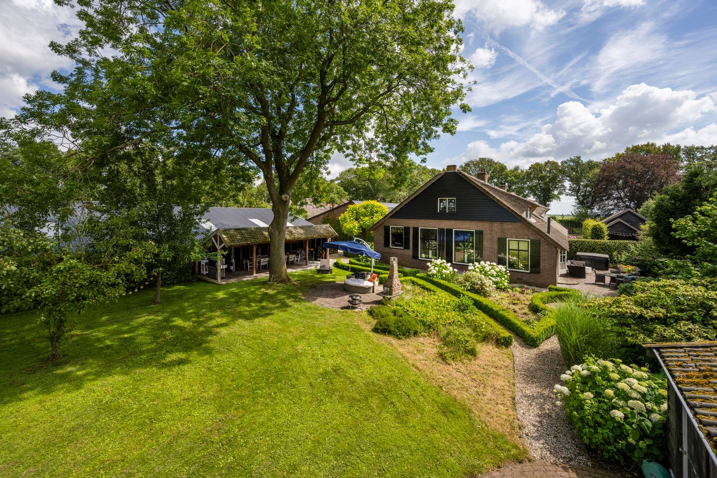 De zeer royale woonkamer is het middelpunt van deze fraaie woning. Hier ervaart u het buitenleven in optima forma. De riante raampartij biedt een magnifiek uitzicht over de prachtige tuin en de daarachter gelegen weilanden. De woonkamer is voorzien van een houten vloer, originele balkenplafond, open haard - het originele tegeltableau bij de open haard is nog geheel aanwezig achter de voorzetwand - en de opkamer, die thans in gebruik is als logeerkamer, maar uiteraard voor meer functies geschikt is. Aangrenzend aan de woonkamer vindt u de woonkeuken voorzien van Bulthaup-keuken met diverse inbouwapparatuur en vloerverwarming, wijnklimaatkast en een gashaard. Ook hier zijn openslaande deuren te vinden naar het op het Zuiden gelegen zijterras.