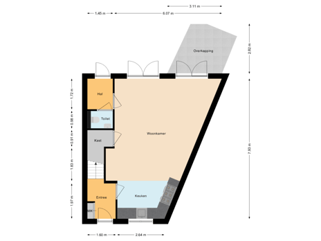 In de hoek van de woonkamer zit tenslotte de toegangsdeur tot een hal met buitendeur. Vanuit deze hal bereik je een aparte toiletruimte die deels is betegeld en verder is voorzien van een vrij hangend toilet en fonteintje.