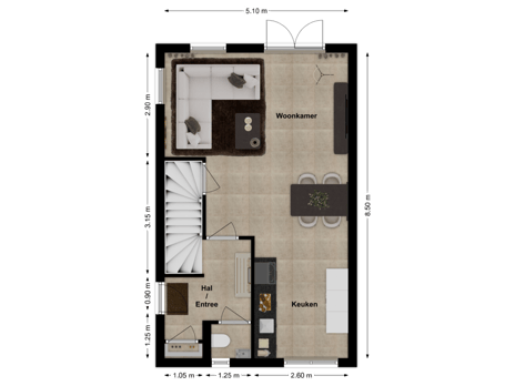 Via de entree stap je binnen in een verzorgde hal met moderne toiletruimte, voorzien van een zwevend closet en fontein. Vanuit hier loop je door naar de lichte woonkamer, waar je meteen merkt wat een hoekligging doet: meer daglicht en een prettige open sfeer. De strakke tegelvloer met vloerverwarming maakt het geheel comfortabel en praktisch. De openslaande tuindeuren verbinden binnen en buiten op een natuurlijke manier. Onder de trap bevindt zich een handige trapkast, perfect voor extra bergruimte zonder concessies te doen aan het wooncomfort.