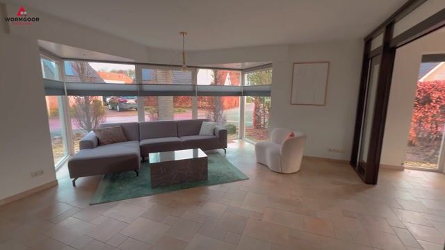 Aan de voorzijde van de woning bevindt zich de woonkamer. De grote raampartijen van vloer tot plafond zorgen hier voor een prachtige lichtinval en een open uitstraling. Je hebt hier volop mogelijkheden om een royale zithoek te creëren. De vaste op maat gemaakte kastenwand geeft de ruimte extra karakter en praktische opbergruimte.