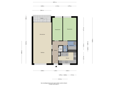 Je betreedt de woning via de ruime ontvangsthal, die toegang biedt tot de keuken, garderobekast, woonkamer, twee slaapkamers, de badkamer en het separate toilet.