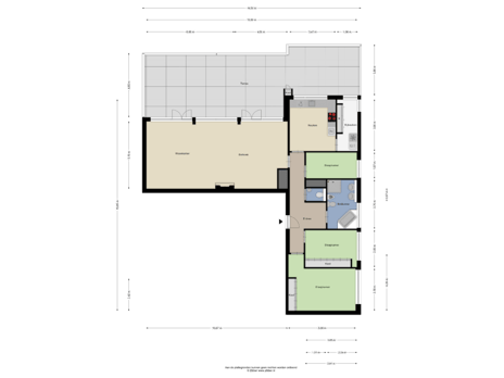De woonkamer is met een oppervlakte van circa 50 m² royaal opgezet en vormt het hart van de woning. De volledige buitengevel is voorzien van grote raampartijen, waardoor de ruimte baadt in natuurlijk licht. Tevens is de woonkamer voorzien van airco welke verkoelt en verwarmt, ideaal om het perfecte binnenklimaat te regelen. Twee openslaande deuren geven direct toegang tot het absolute hoogtepunt van dit penthouse: het riante dakterras van circa 75 m².