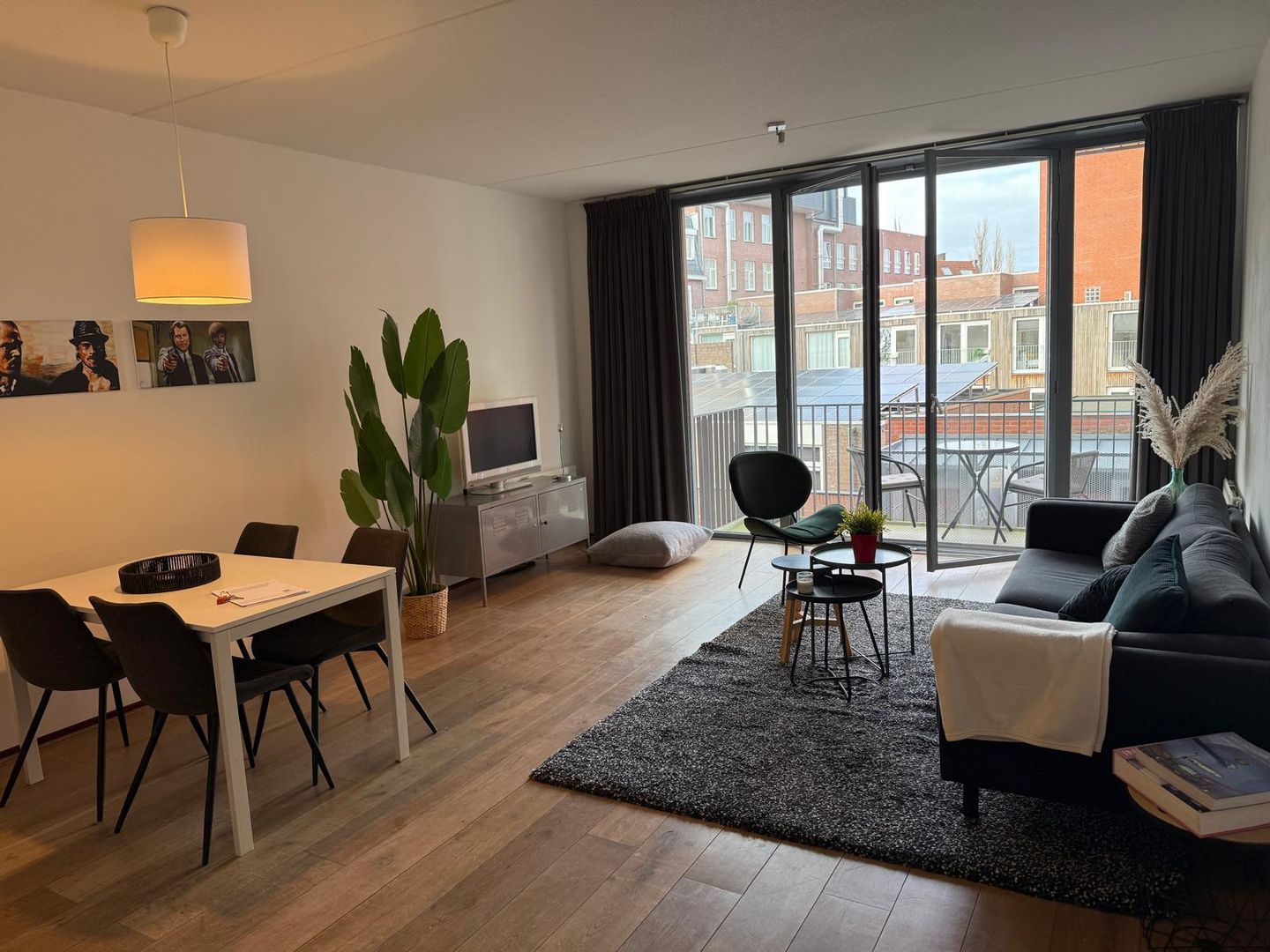 Sfeervolle woonkamer voorzien van een fraaie massief eiken houten vloer en een prettig daglicht door de grote raampartij. Middels openslaande deuren is het balkon te bereiken.
