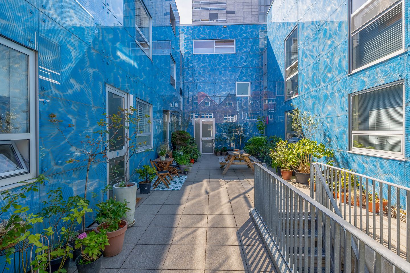 Entree met bellentableau, brievenbussen, toegang tot de eigen parkeerplaats in de parkeerkelder en de individuele berging. Via afgesloten binnenplaats toegang tot de woning.