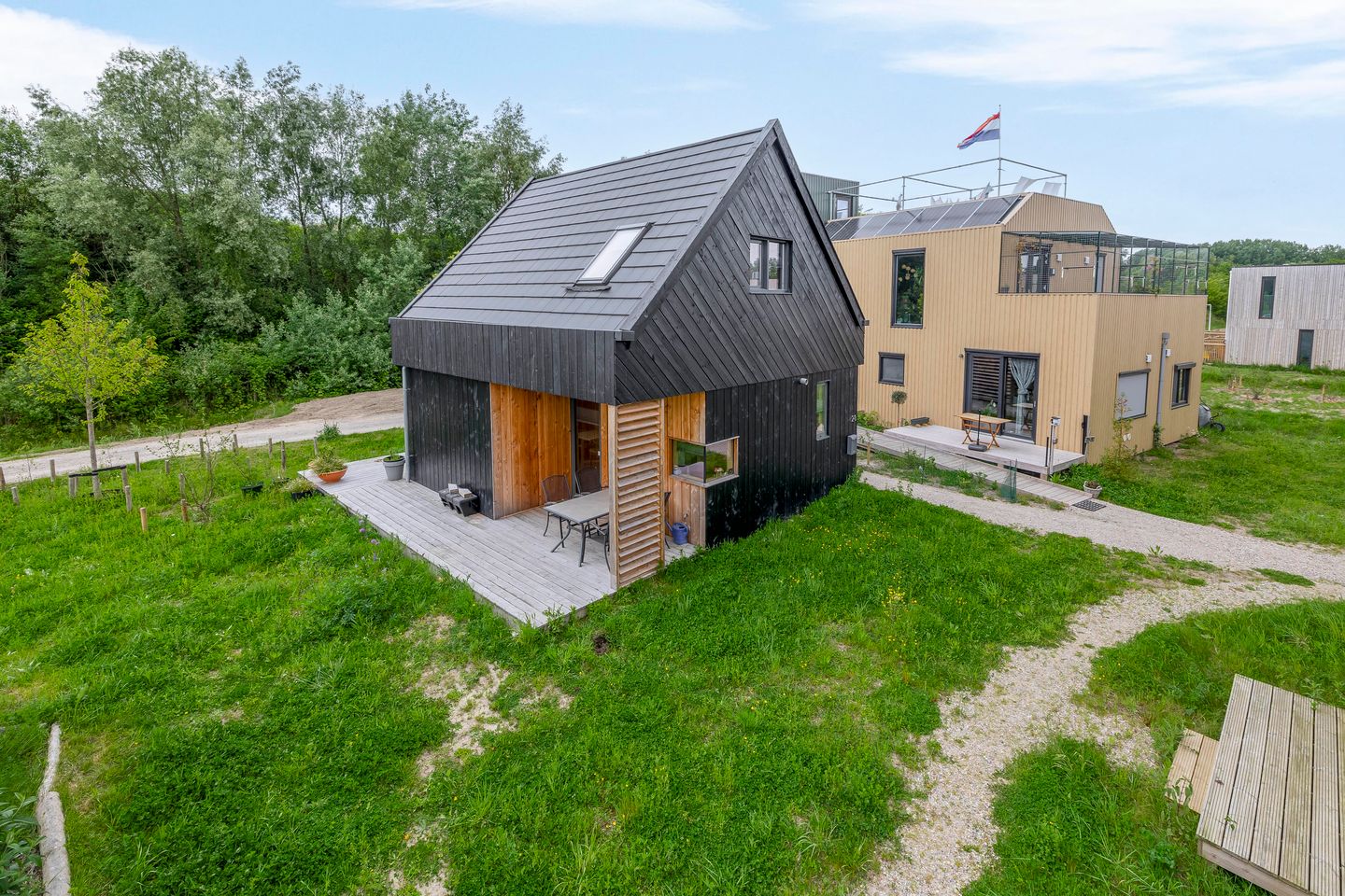 Een recent gebouwd Tiny House (2024) vol charme, gelegen op een unieke plek in het buurtschap Te Veld. Hier komen de levendige energie van de stad en de serene rust van de natuur prachtig samen. In Te Veld ervaar je een moderne manier van wonen: een hechte gemeenschap waarin buren samenwerken en gezamenlijk zorg dragen voor hun leefomgeving. Het delen van voorzieningen behoort hier zelfs tot de mogelijkheden. Dit bijzondere buurtschap ligt aan de rand van Eindhoven en biedt uitstekende verbindingen met belangrijke uitvalswegen, zoals de nabijgelegen A50. Daarbij vind je in de omgeving diverse voorzieningen, zoals basisscholen, middelbare scholen, winkels en sportfaciliteiten. Ook locaties als de Technische Universiteit Eindhoven, de High Tech Campus, ASML en het Catharina Ziekenhuis zijn eenvoudig bereikbaar vanaf deze locatie. Het Tiny House zelf is volledig elektrisch en volledig ingericht met een moderne keuken, een comfortabele badkamer met een douche en een rustige slaapkamer die uitnodigt tot ultieme ontspanning. Wil je de bijzondere sfeer van deze woning zelf ervaren? Plan dan gerust een bezichtiging – we laten je graag zien wat deze Tiny House te bieden heeft! Indeling Binnenkomst middels overdekte entree met dus droge toegang de woning in. Bij binnenkomst valt meteen de extra vrije hoogte op door de aanwezige vide én de prachtige natuurlijke lichtinval door de grote raampartijen. Ook de prachtige open trap naar de slaapkamer is meteen een Eye-catcher en de toepassing van al het houtwerk zorgt voor een rustige en "Scandinavische" sfeer. Ondanks dat het formeel een Tiny House betreft is de indeling dusdanig slim dat de woning perfect is in te delen. Er is een prachtig ruim woongedeelte met plek voor een riante zithoek. Middels dubbele deuren is vanuit hier ook het buitengedeelte toegankelijk en onder de trap is extra bergruimte. In deze ruimte is ook de open keuken gesitueerd met ook vanuit hier middels ramen een prachtig zicht op het groen rondom de woning. De keuken is van alle gemakken voorzien en beschikt over een vaatwasser, koelkast met vriesgedeelte, inductiekookplaat, afzuigkap, oven, spoelbak en meer dan voldoende opbergmogelijkheden. Op de begane grond is ook de keurige badkamer gerealiseerd. De badkamer beschikt over een ruime inloopdouche met hand- en regendouche, wandcloset toilet en wastafel. Tevens is hier een elektrische boiler aanwezig voor het warme water en is er een aansluiting voor wasapparatuur. 1e verdieping Middels de vaste trap is dan de 1e verdieping bereikbaar. Hier is een prachtige open slaapkamer gerealiseerd met ook weer een schitterende natuurlijke lichtinval door de grote raampartijen. De kamer is dusdanig ingedeeld dat deze voorzien is van een inloopkledingkast en er is ook nog een toilet met wastafel gerealiseerd. Tuin Heerlijke buitenruimte rondom fraai aangelegd met houten vlonders waardoor er twee separate terrassen zijn zodat er altijd een plekje in de zon of in de schaduw is. Perfect is natuurlijk het fraaie uitzicht op het groen. Bijzonderheden: * De grond is niet verkaveld, je hebt een plekje in een kamer. De grond onder je huis huur je. Voor de rest sta je in een collectieve tuin die je samen met je buren vorm geeft. Huur van de grond minimaal 13 jaar met stichting met optie tot verlenging voor nog eens 15 jaar. De kosten zijn ca. € 371,42 per maand met een indexering van 2% op jaarbasis. * Je kan het huis verkopen of meenemen naar een andere plek. * De kamers zijn in principe autovrij. Natuurlijk kan er een verhuisbusje of ambulance komen, maar parkeren doe je in de aangrenzend parkeerruimte. In Buurtschap te Veld heb je dus niet je auto ‘voor de deur’. * Hypotheek op de woning is beperkt mogelijk, overleg hierover met je hypotheekadviseur.