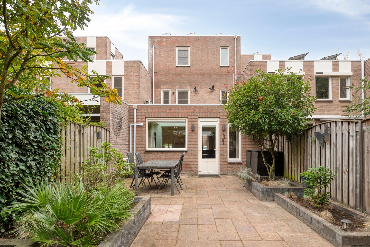 De diepe achtertuin op het noordoosten is grotendeels betegeld, voorzien van plantenbakken met beplanting, een stenen barbecue en een buitenkraan. Onder de sfeervolle overkapping kun je heerlijk beschut genieten met zicht op groen. De tuin is zowel via de woning als via de achterom bereikbaar.