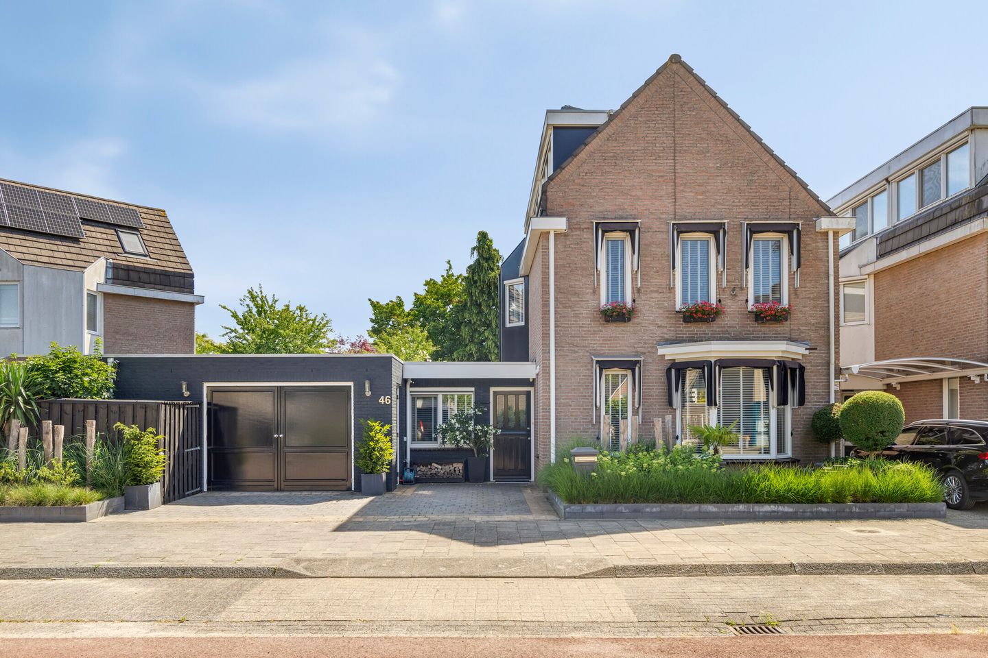 De voortuin is modern en strak aangelegd.