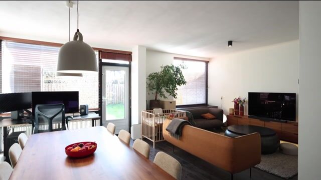 De woonkamer is ruim en licht opgezet en voorzien van grote raampartijen die zorgen voor een prettige lichtinval. De ruimte beschikt over een praktische trapkast en een directe verbinding met de tuin.