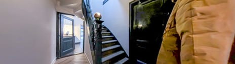 Bij binnenkomst treedt u binnen in een ruime hal met hoge plafonds, een visgraat PVC-vloer, karakteristieke glas-in-loodramen en een strakke stucwerkafwerking van wanden en plafond. Vanuit de hal is er toegang tot de voorkamer, eetkamer, keuken en de trap naar de eerste verdieping.