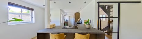 De woonkamer heeft door de glazen industriële deur vanuit de gang een open verbinding. In het voorgedeelte van de woonkamer kunt u lekker genieten van de gaskachel. Bij warme dagen kunt u de dubbele deur openzetten, waardoor de woonkamer een mooie open verbinding krijgt met de achter tuin. Door de grote glaspartijen in roede uitvoering komt verrassend veel daglicht binnen en kunt u lekker genieten van het fraaie uitzicht op de achtertuin.
