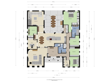 De begane grond bestaat uit een aaneenschakeling van fraaie ruimtes, elk met een eigen sfeer en prachtig zicht op de tuin. Samen vormen ze een ruim en harmonieus geheel met meerdere functies. Zo grenst de eetkamer gelijk aan de keuken, deze is op haar beurt voorzien van een luxe keukenopstelling met een groot kookeiland en een wandopstelling met twee vaatwassers, stoomoven en een combi-oven/magnetron. De stijlvolle keuken is voorzien van alle denkbare inbouwapparatuur zoals twee wijn klimaatkasten, inductie kookplaat en een quooker en waarborgt vele uren gezelligheid en kookplezier. Een aangrenzende provisieruimte en de bijkeuken bieden een grote hoeveelheid praktisch bergruime met aansluiting van de wasmachine en droger middels een inbouw kast bevindt zich hier ook een extra koelkast.