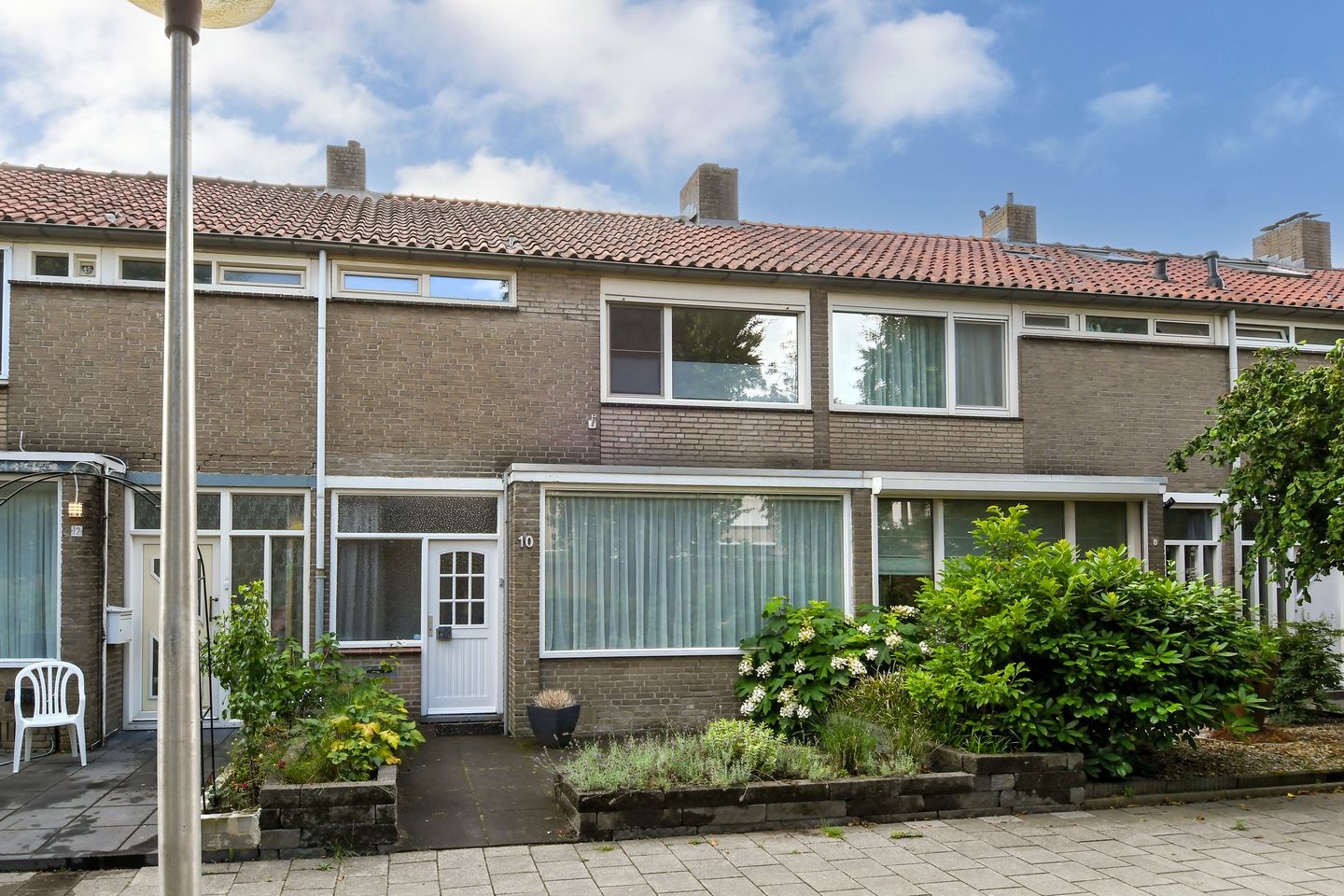 De voortuin, in de afgelopen jaren opnieuw aangelegd, maakt het plaatje compleet: strakke grijze tegels, gemetselde plantenbakken en een verzorgde uitstraling.