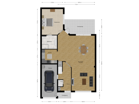 De ruime woonkamer is licht en prettig ingedeeld, met een duidelijk zit- en eetgedeelte. Grote raampartijen zorgen voor veel daglicht en een fijne verbinding met de tuin. De houten vloer geeft de ruimte een warme uitstraling en vormt een mooie basis voor diverse interieurstijlen.