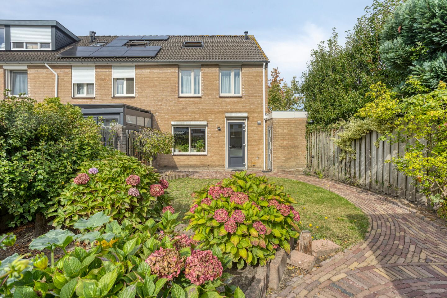 De geheel omheinde achtertuin (17,5 m diep en 7 m breed) is heerlijk zonnig, op het zuiden gericht. De achtertuin beschikt over twee terrassen, gazon, bestrating, borders met vaste beplanting en poort naar achterom.