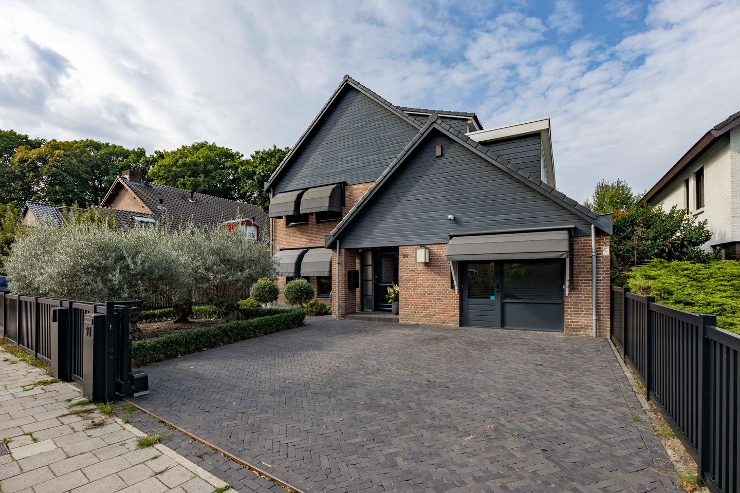 Via de brede, rustige straat bereik je de oprit met ruimte voor meerdere auto’s. Je komt binnen in een indrukwekkende hal met een stijlvol trappenhuis. Meteen voel je dat hier aan alles is gedacht: een luxe toiletruimte in hotelstijl, stalen deuren, en een afwerking die strak en toch warm is.