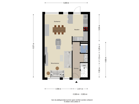 Begane grond met tegelvloer, beide verdiepingen met tapijt en laminaat.