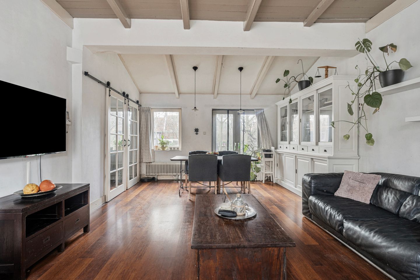 Aan de rechterzijde van de hal is de naar achteren uitgebouwde woonkamer gelegen, waar vroeger het brood werd gebakken. De woonkamer loopt in de gehele diepte van het pand en geniet door de grote halfronde voorramen en de openslaande tuindeuren achter veel leefruimte en natuurlijke lichtinval. Let vooral op het 3 meter hoge authentieke balkenplafond en de originele details die hier, en in de rest van de woning in overvloed aanwezig zijn. Door de riante afmetingen is in deze kamer meer dan voldoende ruimte voor een royale opstelling van de eettafel en de zithoek. De houtgestookte kachel is gekoppeld aan de radiatoren, waardoor gezellig stoken in de winter de hele woning mee verwarmt. De voormalige zij-ingang van de bakkerij aan de voorzijde kan dienstdoen als houtopslag. Naast deze ingang, voor een van de grote ramen van de woonkamer staat een authentieke Zeeuwse sleedoorn, die in de vroege lente prachtige bloesem draagt.