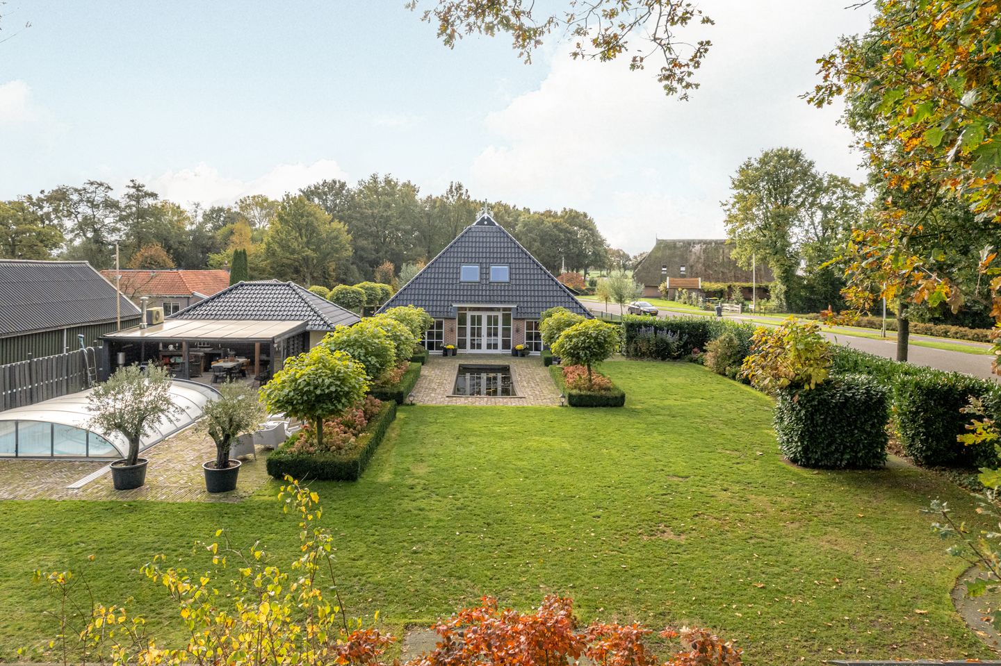 Eerst naar de woonkamer keuken (2016) en eetkamer. Hier heb je uitzicht over je erf, prachtig ook nu in de herfstkleuren. Een vijver, zwembad en gewoon een compleet aangelegde tuin heb je tot je beschikking. De openslaande deuren naar de tuin zitten fraai in het midden van de imposante achtergevel.