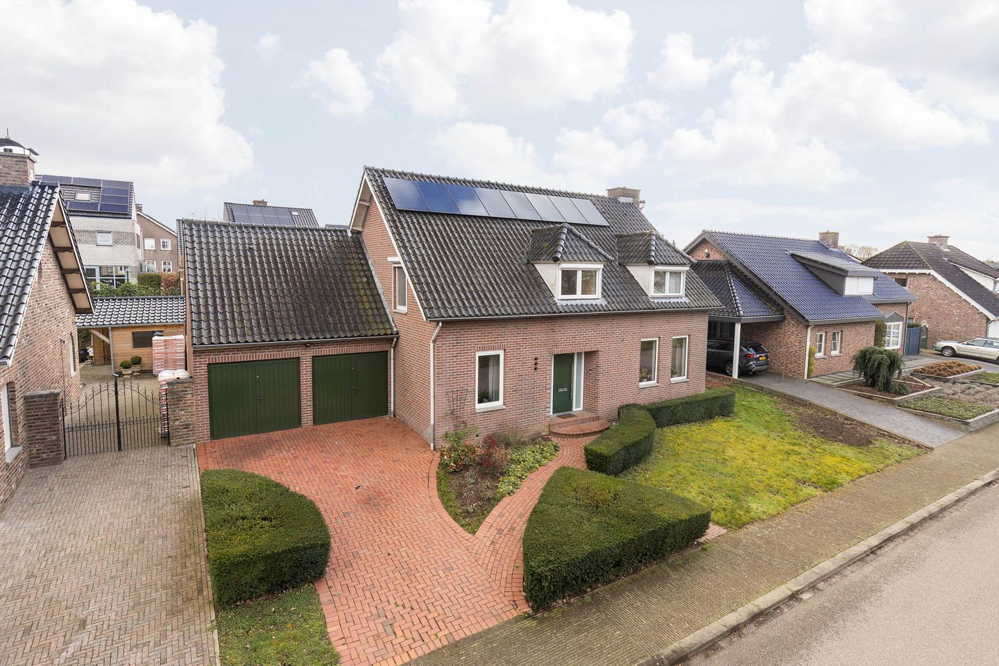Omgeven door alle andere unieke vrijstaande woningen ligt deze woning in een gevarieerd straatbeeld en beschikt het over een vrij uniek, vierkant perceel. Door het brede perceel in de volle breedte veel mogelijkheden, te weten van links naar rechts, de mogelijkheid met wat aanpassing in de beplanting voor een dubbele oprit voorafgaand aan de dubbele garagepoorten. Aan de rechterzijkant van de woning is eveneens nog een brede rechtstreekse tuintoegang aanwezig.