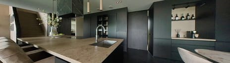 Indeling villa: Bij binnenkomst treft u een hal met toilet en garderobe. De speels ingedeelde living biedt een naadloze overgang tussen de zitkamer (zeer fraai met een plafond hoogte van 5,60 meter en een plafond hoog raam), speelkamer, werkkamer en woonkeuken, waarbij de ruimtes open en ruimtelijk aanvoelen, zonder deuren, maar toch duidelijk een eigen functie hebben. Bijna de hele achtergevel bestaat uit glas waardoor je vanuit bijna alle ruimtes een fraai uitzicht op het achtergelegen, elk jaargetijde wisselend, landschap hebt. De luxe maatwerk woonkeuken met groot kookeiland is uitgerust met hoogwaardige inbouwapparatuur, waaronder een SMEG vijfpits inductiekookplaat met grote oven, een afzuigkap met plasmafilter, een grote koelkast en aparte grote vriezer, een vaatwasser op hoogte, een Quooker en een aparte koffiehoek. Vanuit de keuken is de bijkeuken, welke ook met achterdeur van buiten bereikbaar is, toegankelijk. De bijkeuken is tevens voorzien van maatwerk kasten. Hier bevinden zich de meterkast, garderobekast, extra kastruimte en de technische ruimte met de warmtepomp, extra grote boiler en WTW-installatie. Aangrenzend aan de keuken aan de tuinzijde, bereikbaar door glazen schuifpui, ligt een ruime serrekamer met glazen schuifwanden die volledig geopend kunnen worden, waardoor binnen en buiten perfect in elkaar overlopen. De serre is voorzien van een sfeervolle haard. De gehele begane grond is afgewerkt met een strakke, donkere gevlinderde betonvloer, wat de woning een moderne en robuuste uitstraling geeft en zorgt voor eenheid.