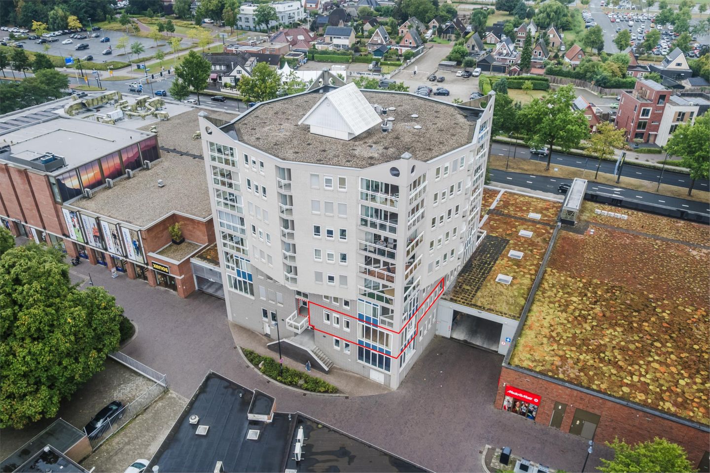 Grote bekende winkels liggen naast de deur.