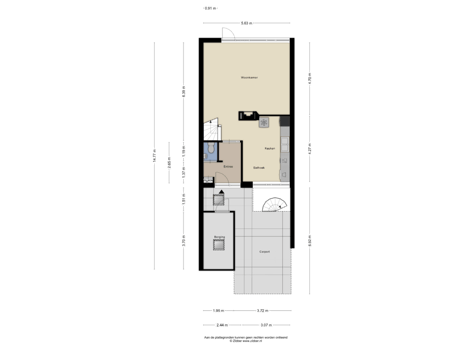 Bij binnenkomst stap je de hal binnen, waar zich de meterkast en het toilet bevinden. Vanuit de hal heb je toegang tot de halfopen keuken, gelegen aan de voorzijde van de woning. De keuken in hoekopstelling biedt een fijne werkruimte en staat in open verbinding met de woonkamer.