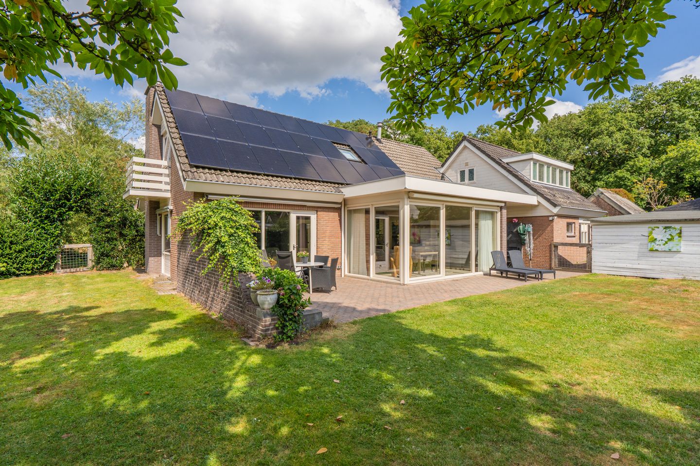 Buiten word je verrast door de prachtige tuin op het zuiden. Meerdere terrassen zorgen ervoor dat er altijd wel een plek in de zon of schaduw te vinden is. Naast de dubbele carport en garage is er ook een vrijstaande berging met overkapping, ideaal voor tuinspullen of fietsen.