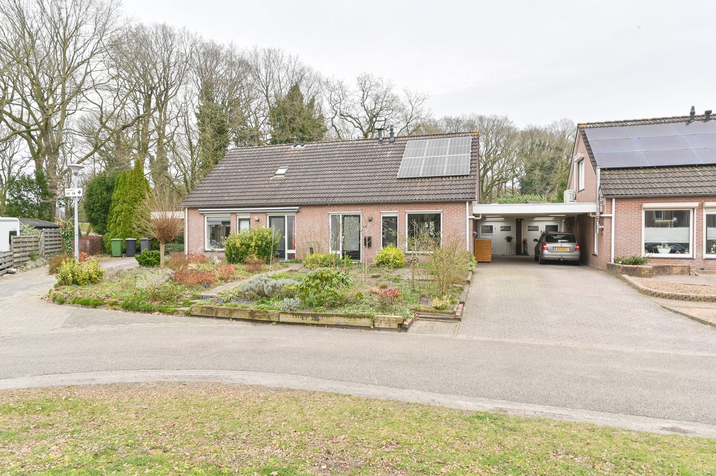 De voortuin is eveneens netjes aangelegd met vaste beplanting en een verhard looppad voor de gevel langs. De oprit biedt de mogelijkheid om je eigen auto op te parkeren.