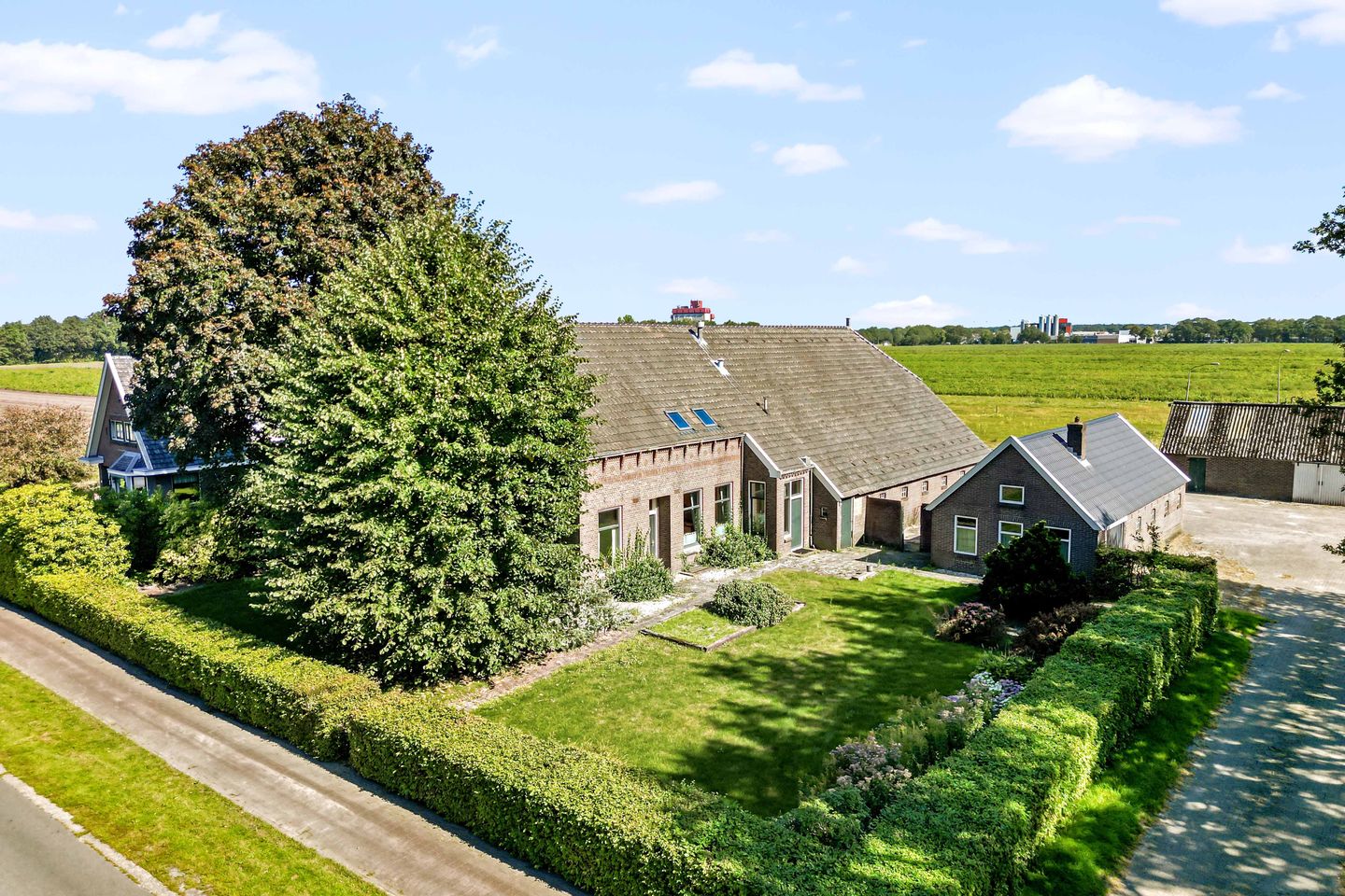 Deze markante, karakteristieke (woon)boerderij met twee vrijstaande bijgebouwen wordt aangeboden met een kavel van ca. 4000 m².