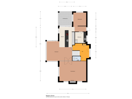 begane grond: hal/entree met toilet en meterkast, ruime woonkeuken met veel lichtinval en luxe inbouwkeuken voorzien van kookeiland en diverse apparatuur, schuifpui naar het overdekte terras, sfeervolle woonkamer met gashaard aan de voorzijde, tussenhal met achterentree, werkkamer/slaapkamer, bijkeuken met witgoedaansluitingen, CV ketel en extra keukenblok met gootsteen.