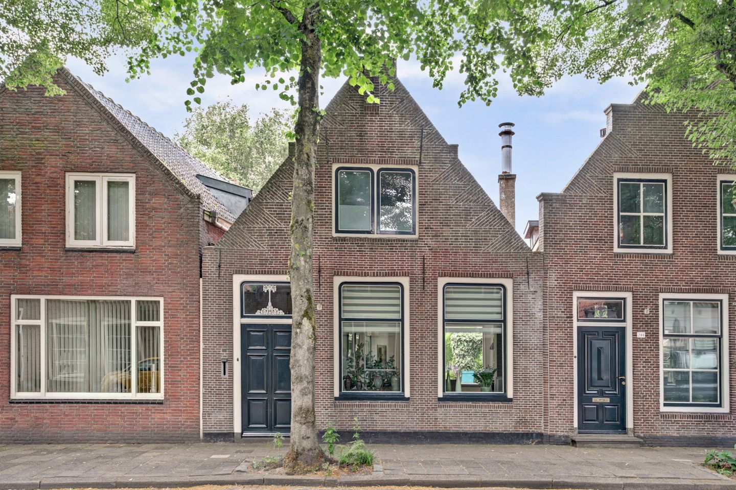 - Karakteristieke details zoals de puntgevel met toppilaster, gesmede muurankers en de levensboom boven de voordeur.