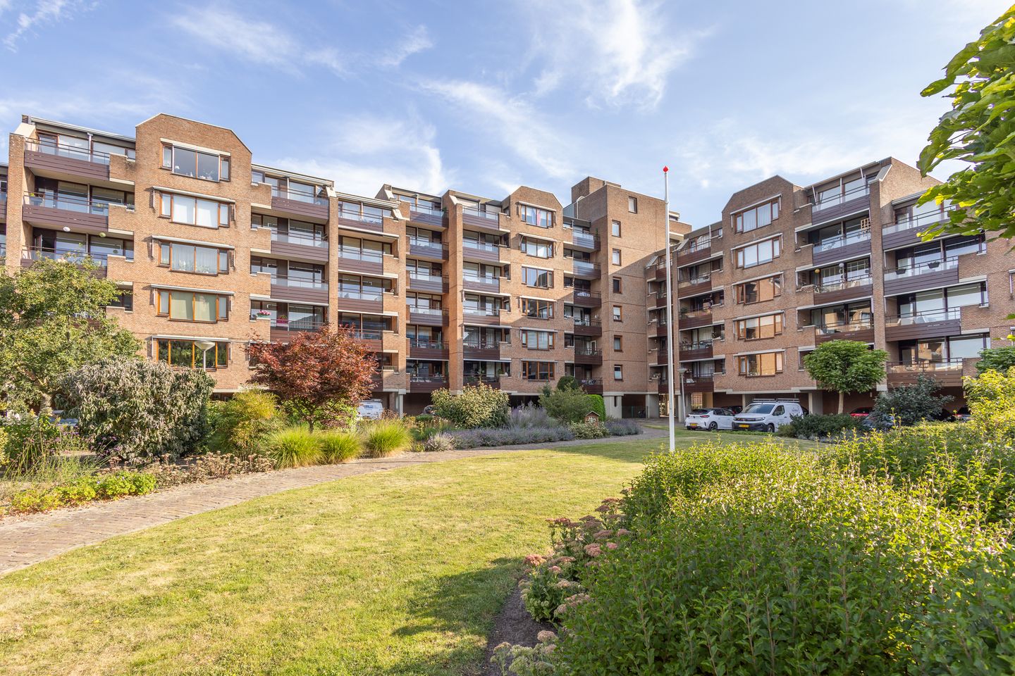 Het appartement beschikt over twee balkons: het kleinere balkon is bereikbaar via een van de keuken, het grotere balkon (op het zuiden) is vanuit de woonkamer toegankelijk en kijkt uit over de rustige binnentuin.