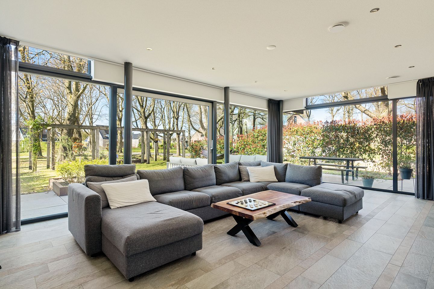 Vanuit de hal loop je direct door naar de woonkamer, een ruimte die door de grote glaspuien aan zowel de voor- als achterzijde van het huis werkelijk baadt in het licht. De enorme raampartijen bieden een prachtig zicht over de tuin en het omliggende groen waardoor het voelt alsof je één bent met de natuur. Deze woonkamer is dan ook de perfecte plek om te ontspannen én om gezellig samen te zijn met familie en vrienden.