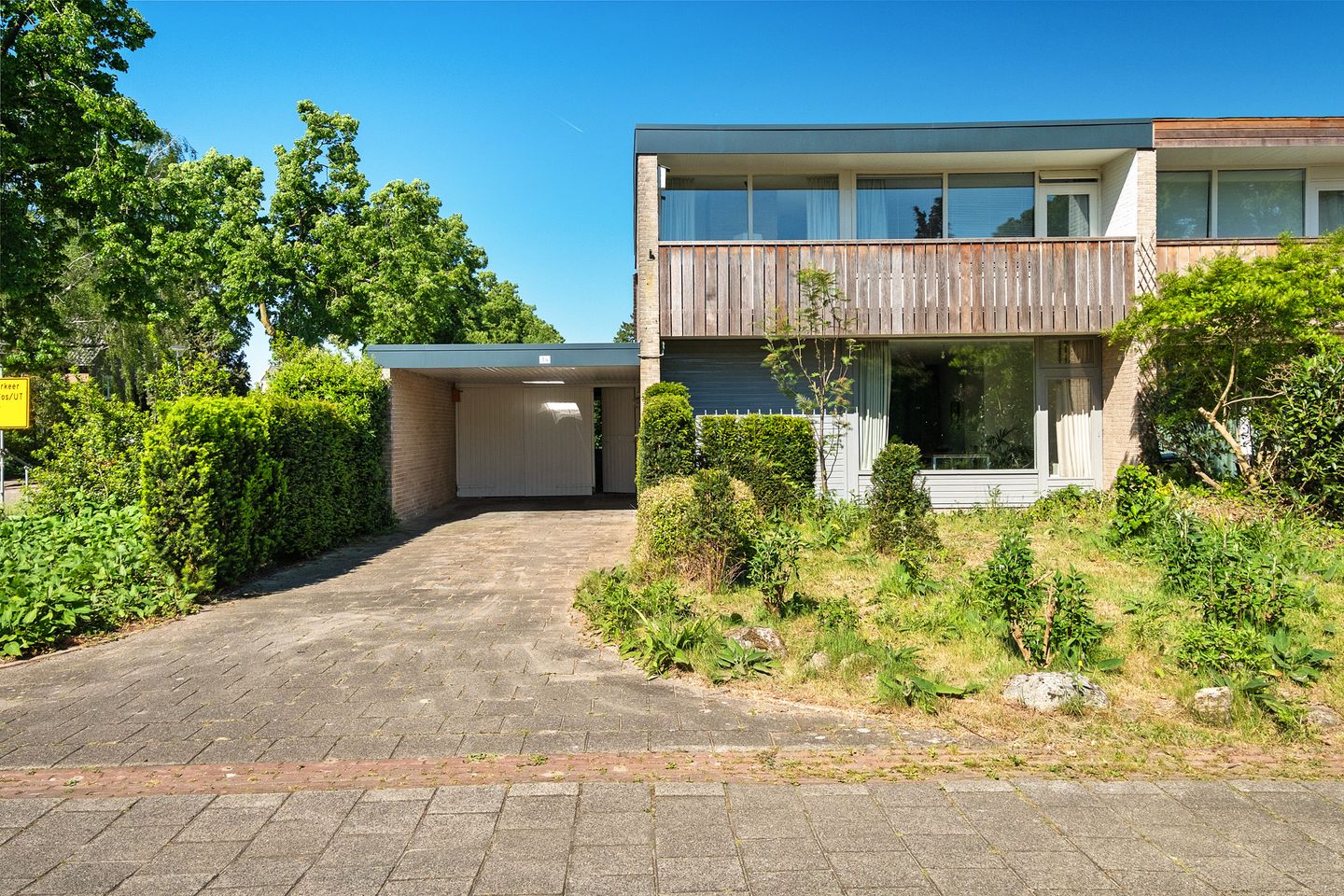 Via de eigen oprit en carport kom je binnen in de ruime hal met een originele, kenmerkende vloer. Hier bevinden zich de garderobe en de toiletruimte. De woonkamer is een fijne, lichte ruimte met een sfeervolle haard, heerlijk voor de koudere dagen. De vloer is voorzien van vloerbedekking, wat bijdraagt aan het huiselijke gevoel. De halfopen keuken is in 2024 vernieuwd en volledig ingericht met een 4-pits inductiekookplaat, vaatwasser, kunststof werkblad, spoelbak en een afzuigkap met motor. De koelkast en combimagnetron zijn mooi weggewerkt in een separate kast. Een fijne plek om te koken en tegelijkertijd in contact te blijven met wat er zich in de woonkamer afspeelt. Vanuit de keuken is er directe toegang tot de royale garage/berging.