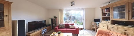 Je komt binnen in een ruime hal met garderobe en trapopgang. De woonkamer is tuingericht en opvallend licht dankzij de grote schuifpui naar het zonneterras. Deze woonkamer is een hele fijne leefruimte, waar je een heerlijke hoekbank kunt plaatsen en een lange eettafel.