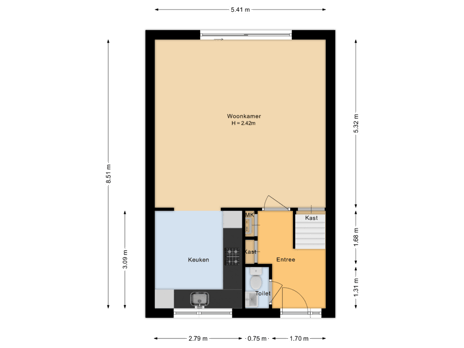 - 76 m² (14,00 meter diep en 5,40 meter breed)