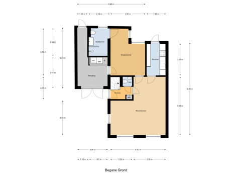 Entree, hal met meterkast en toilet met wandcloset en fonteintje (2021). Woonkamer met laminaatvloer en toegang tot de praktische keuken met inbouwapparatuur zoals een 4-pits gaskookplaat, afzuigkap, oven, koelkast, vriezer en composiet werkblad. Ruime slaapkamer met toegang tot de badkamer met inloopdouche, wandcloset en wastafelmeubel. Bijkeuken/berging met kastenwand met aansluiting wasmachine en droger. De berging heeft een voor-en achteruitgang.