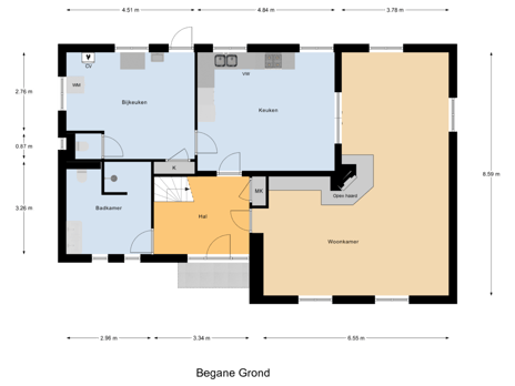 De zeer ruime entree/hal geeft toegang tot een woonkamer, badkamer, woonkeuken en vaste trap naar de eerste verdieping. Voorzien van een tegelvloer, schoonmetselwerk- wanden en een houten delen plafond. Verder voorzien van een meterkast met ca. 9 -11 groepen en krachtstroom, aardlekschakelaar.