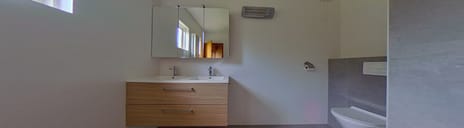 Voorzien van een tegelvloer met vloerverwarming, spachtelputz wanden en een Agnes platen plafond.