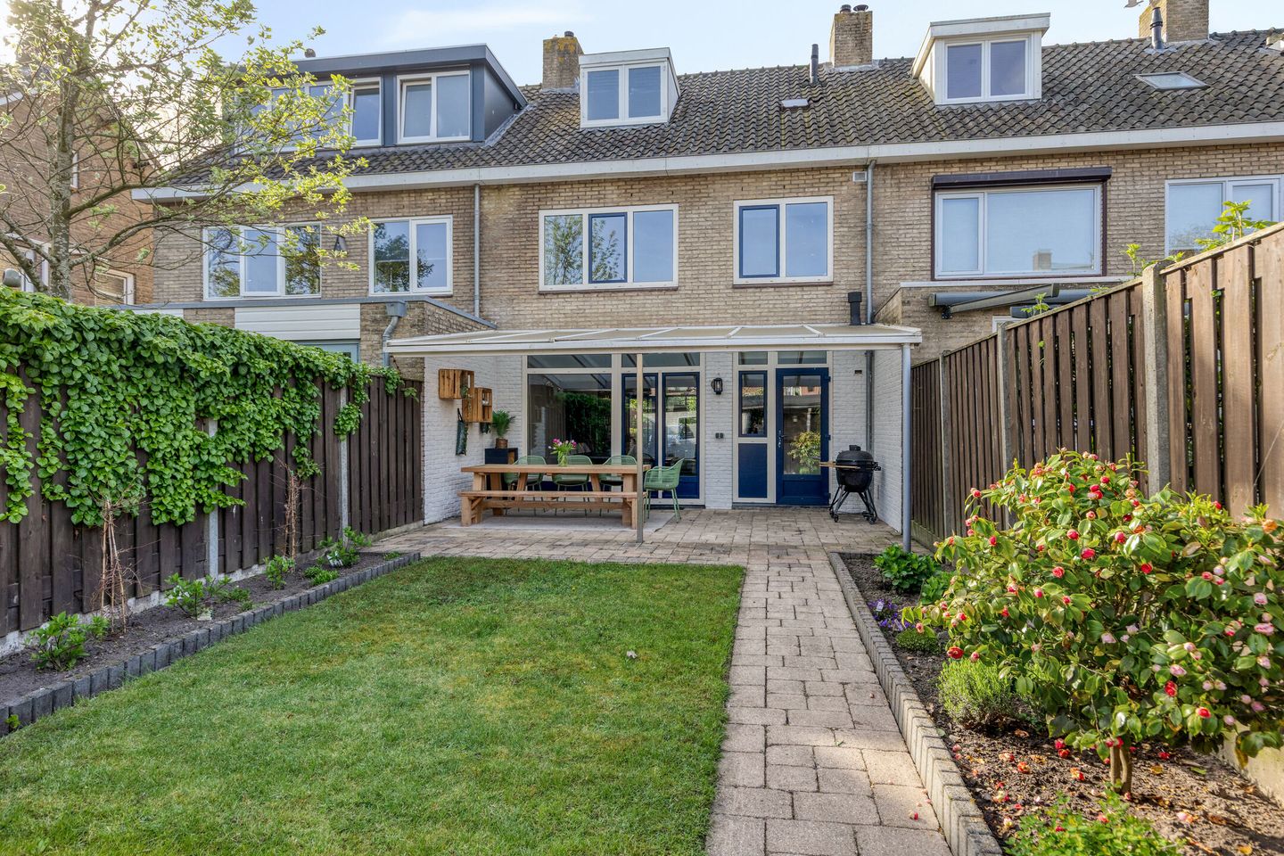 Vanuit de overkapping kijk je mooi de diepte van de tuin in. Het pad brengt je naar achteren, met aan weerszijden groen, plantenborders en gazon. Daardoor voelt de tuin verzorgd, gezellig en bruikbaar tegelijk. Je hebt ruimte om buiten te eten, te borrelen, te tuinieren of gewoon lekker in de zon of schaduw te zitten.