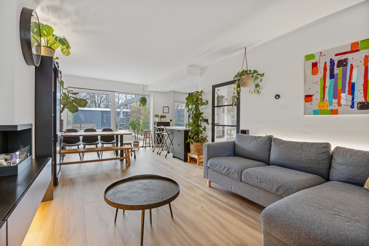 We lopen vanuit de hal door naar de woonkamer. Een heerlijke ruimte met veel licht dat via de grote ramen binnenkomt. Aan de achterzijde is een grote schuifpui aanwezig (maart 2024) die in het voorjaar al lekker opengezet kan worden. De tuin wordt dan volledig bij de woonkamer betrokken. Nu de dagen wat korter zijn is het gezellig om binnen de (bio ethanol) haard aan te doen (deze is ter overname). Dat zorgt voor extra sfeer en gezelligheid.