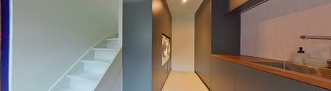 Entree / hal / gang, met (open) trapopgang, de meterkast (20 groepen, meerdere aardlekschakelaars, digitale dag- & nachtstroom tariefmeter), het toilet en toegang tot de tussenkamer.