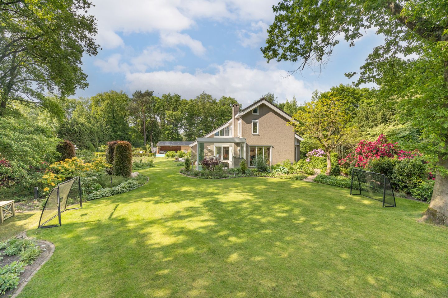 De woning heeft een grote tuin rondom de woning. Hier bevindt u zich midden in de natuur en maakt u alle jaargetijden van dichtbij mee. De tuin is prachtig aangelegd en voorzien van meerdere terrassen waar u heerlijk van de zon en schaduw kunt genieten. Onder de grote aangebouwde serre, die voorzien is van opvouwbare glazenwanden, worden heel wat uurtjes doorgebracht, een hele fijne plek om te zitten. Er zijn in de tuin ook borders met beplanting, een gazon, een vijver, een speelveldje, een bosgedeelte en grote volwassen bomen aanwezig.