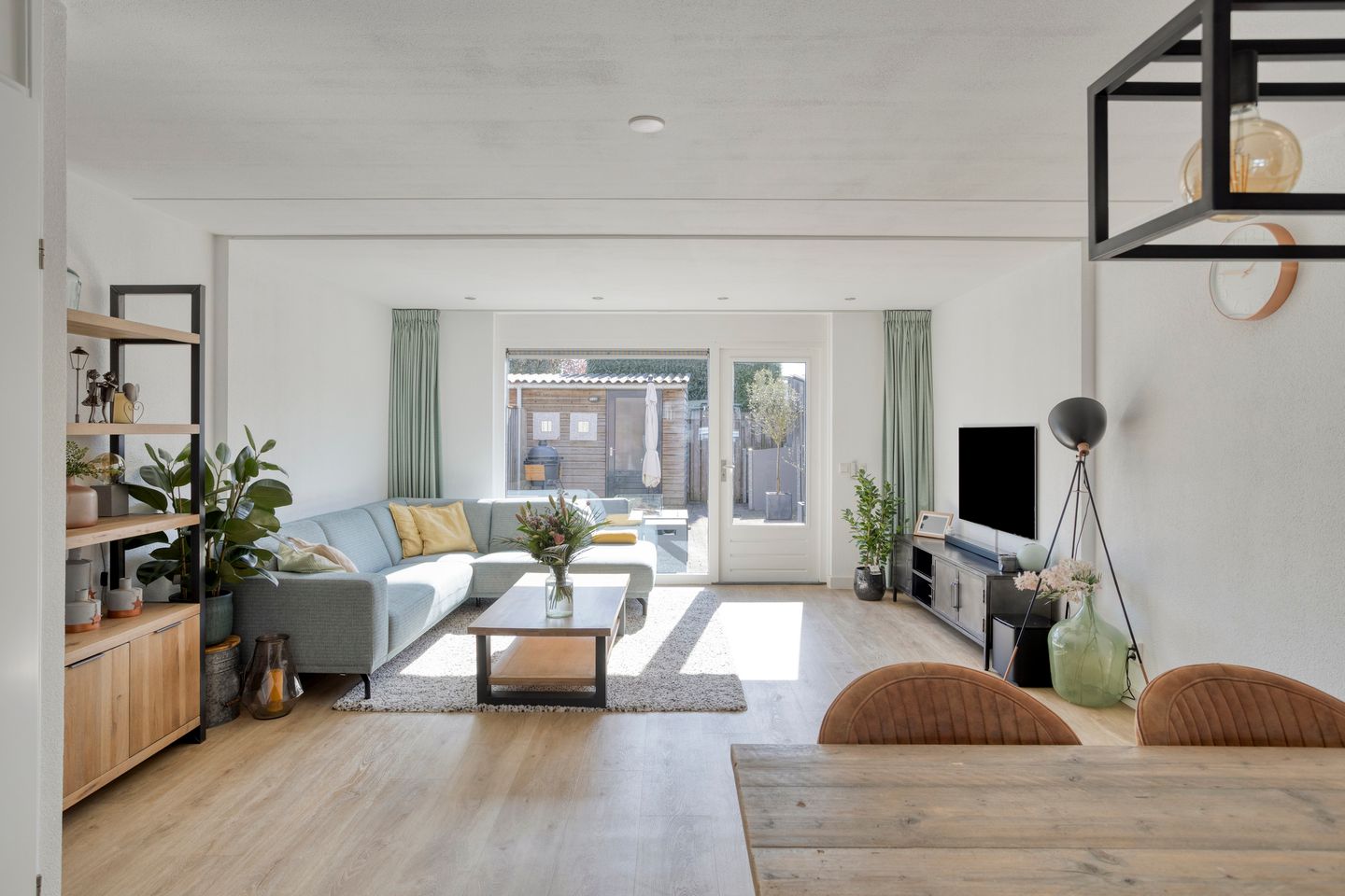Zodra je de woonkamer instapt, voel je direct het licht en de ruimte van deze woning. Aan de achterzijde ligt de royale woonkamer en aan de voorzijde is de luxe keuken geplaatst. In de achtergevel zit een groot kozijn met een raam tot aan de grond en daarnaast een loopdeur met een grote ruit, waardoor het woongedeelte heerlijk licht is. Het zitgedeelte is tuingericht en biedt volop ruimte voor een grote hoekbank en een tv-meubel. Daarnaast houd je nog genoeg ruimte over voor bijvoorbeeld een losse kast of een speelhoek, waar met blokken, boekjes of een speelgoedkeukentje gespeeld kan worden terwijl jij gewoon zicht houdt op alles wat er gebeurt.