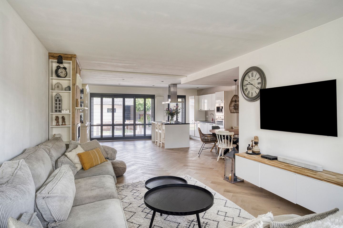 Loop je de woonkamer binnen, dan voel je meteen de ruimte: met een totale oppervlakte van 51,2 m² is dit een leefruimte die volop mogelijkheden biedt. Aan de voorzijde is plek voor een royale zithoek met een grote hoekbank, tv-meubel en eventueel nog een leesstoel. In het midden van de kamer kun je gemakkelijk een grote eettafel plaatsen, maar ook een speelhoek voor kinderen of een werkplek. De vele ramen in de voor- en achtergevel, plus de grote schuifpui en loopdeur naar de tuin, zorgen voor veel lichtinval.